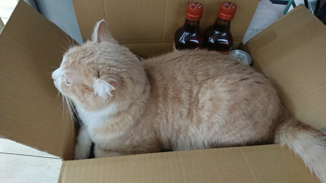 スタッフTさんの机の下の段ボール箱。