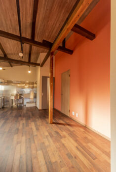 「梁あらわし」工法で和モダンな空間が実現した1階リビングルーム。
