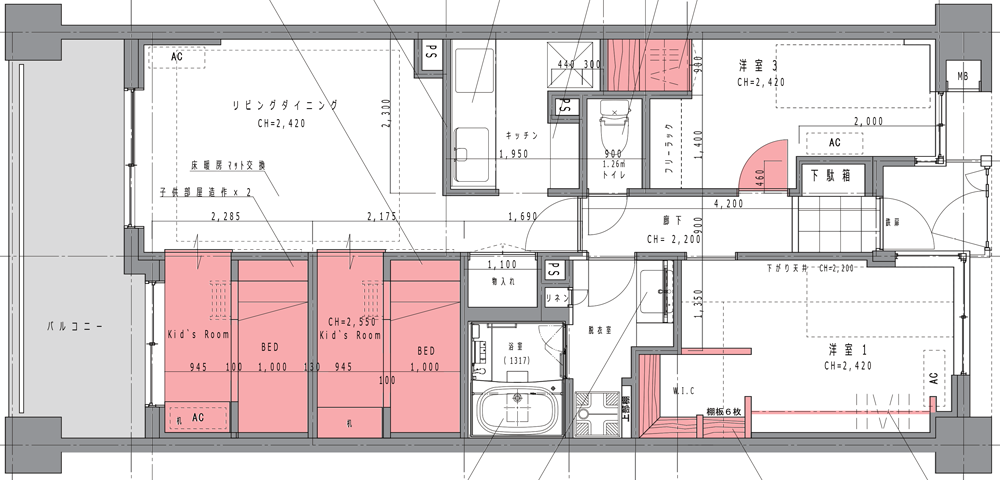 3LDKのマンションに、収納スペースを確保しながら間取り変更し、4つの個室を作りました。